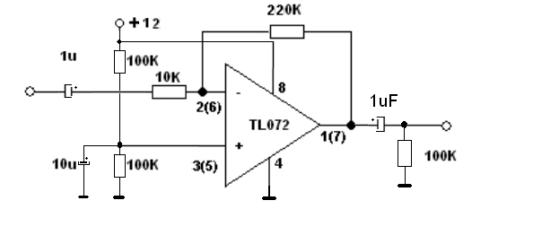 Az erősítés a visszacsatoló (220k) és a bemeneti (10k) hányadosa. A rajz szerint 22x -es. Bementi ellenállásnak 47k -t javaslok. Ekkor már csak 5 -szörös az erősítés, de ettől nagyobbra ritkán szokott szükség lenni.