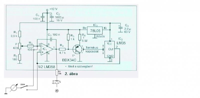 Üdv! Készült egy hőmérséklet referencia. Az alutömb hőmérséklete 20-76 fokig beállítható a potival, a rákapcsolt műszer a beállított vagy a valós hőmérsékletet mutatja mV-ban, köszönhetően az LM35 arányosságának. A szabályzás jól működik, +- 1 fokon belül tartja, de az alutömb felületén már jóval nagyobb különbséget érzek, pedig a szenzor a fűtőtranzisztor mögött van a tömb belsejében. Ez sajnos kevés, alu helyett is a réz lehet, hogy jobb lett volna.