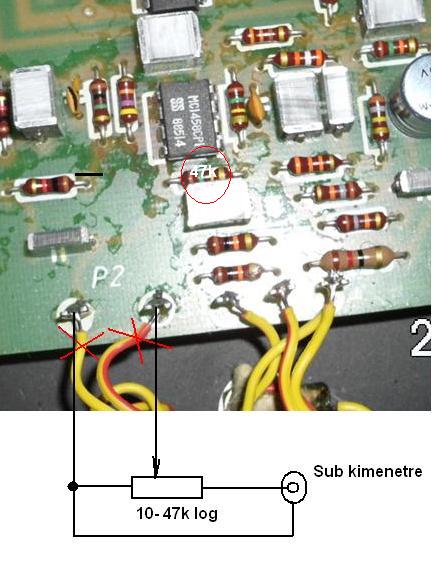 A sub kimeneted jelnagyságát, és terhelhetőségét nem ismerem, így általános értékekkel számoltam. Egy poti és egy 47k ellenállás kéne a kísérlet elvégzéséhez. A piros karikával jelölt ellenállást minitoron keresztül 35 ohm -nak látom, ha a valóságban 22k-tól nagyobb, nem fontos cserélni 47k-ra.