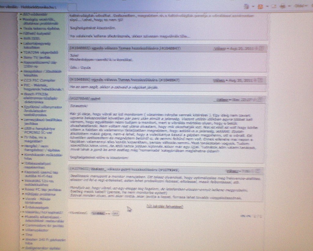 Sziasztok! Csücsül az asztalomon egy ViewSonic VA1916w monitor, amire anno (kb 3-4 éve ) azt mondták , jó kis monitor. Én alá is írtam volna, hogy jó, de mégsem: Mostanában ( már legalább fél éve ) néha bevörösödik a monitor, van, hogy csak fokozatosan vörösödik, és nem lehet megszüntetni. Néha , ha mozgattam a kábelt akkor eltűnt, de ezt mára már csak hülyeségnek tartom, és beképzelésnek, hogy azért tünt el, mert jobban figyelem és mégsem. Egy számítógép szerelővel szétszedtük a monitort (aki hasonlóval foglalkozik ) és semmi hibát se a táppanelon nem láttunk , sem azon a panelon, amelyikre a csatlakozó forrasztva van. Ő azt ajánlotta, hogy minden forrponthoz nyomjunk oda (monitor csatlakozó kék izéhez) egy kis ónt, ami tartalmaz ólmot, mert a mai dolgoknak mind az a hibája , hogy ólommentes ónt használnak, ami EU szabvány miatt van. Hát ezt meg is tettük, átforrasztgattuk, monitor bekapcs, örültünk semmi hiba. Tegnap újra kezdte. Amúgy sem volt gyakori ez, volt, hogy a héten csak 1-szer, de volt, hogy egész nap előjött. Ja, és mindig csak a piros árnyaltban, sosem más színben.