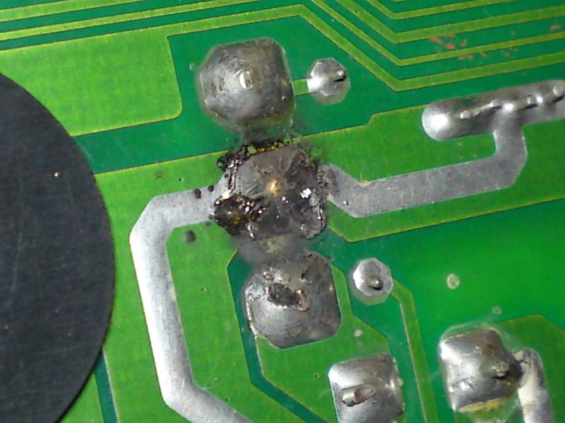 A képen egy rossz forrasztás van, vagy túlhevült az alkatrész, vagy a gyári forrasztás után nem volt jó a kontakt és azért fejlődött hő. Amit mellette, az előbb jelöltem az a mostani képen elfogadhatóan néz ki. A kondi lába továbbra is gyanús.