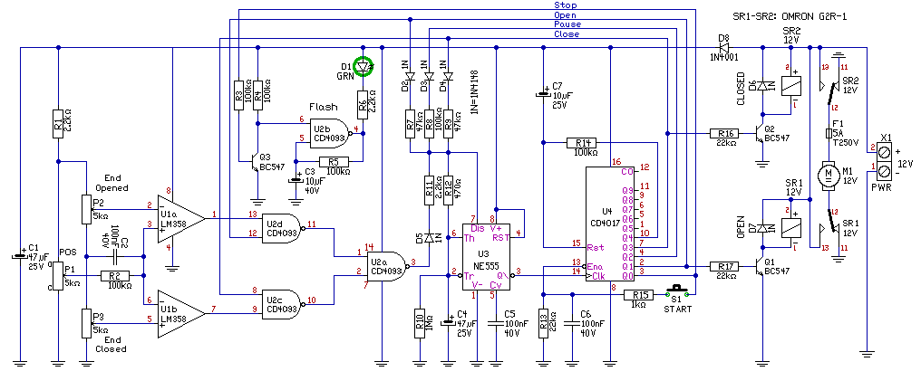 Nekem már a kezdeteknél gondom volt az interferenciákkal. A 4017 bemenete nagyon érzékeny freki ingadozásra és mivel én kis tömör panelt terveztem hozzá , valamint egy kondi lába közel volt a 4017 impulzus lábához ezért minden kis "szarra" ugrott egyet. Persze ez egy szellősebb paneltervvel küszöbölhető. Az én kapumhoz csináltam egy avr attiny vel egy programozott nyitogatót így ha akarom akkor még változtatni is tudom a progit. Egyszerűbb is és ha stabilizálod az 5 voltot az avrnek akkor igen üzembiztos. Már több mint egy éve megy zakkanás nélkül. A mechanikához 12v os lada ablaktörlő motorokat vezérlek 24 voltal és 4 amperrel. simán bírják arra a rövid időre amíg kinyit-becsuk.