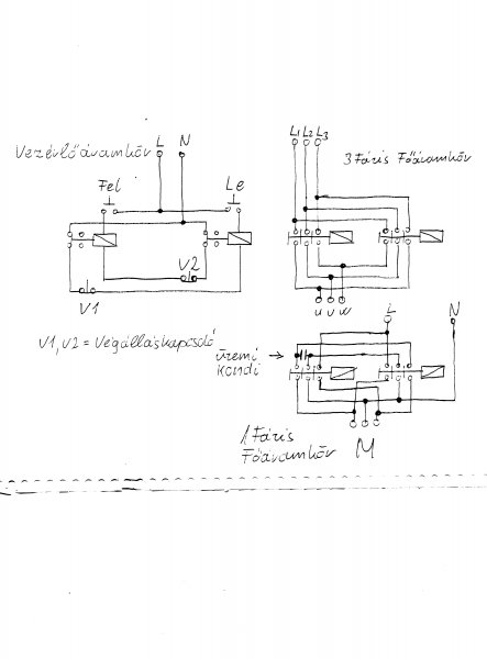 Úgy kell bekötnöd, hogy egy adott végállásból mindig csak a másik irányba indulhat. Ehhez kell a 2 irány nyomógombja és 1 a vészleállásnak. Ez minden irányban azonnal megállítja a motort. A végállásokhoz dupla végálláskapcsolót rakj, fő a biztonság. Ha valahol félúton lett megállítva, akkor onnan bármerre mehet.