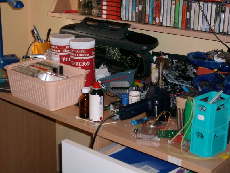 És ha már a rendrakásról, átpakolásról írtam az előbb, hadd mutassam be, hogy volt még ennél sokkal rosszabb is. Az első szereléseket a régi szobámban az íróasztalomon csináltam, kevés hely, kevés felszerelés, és persze még itt kellett tanulnom is hétköznap délutánonként. Néhány héten belül a képen látható volt az eredmény.
