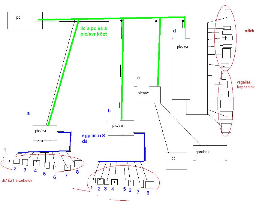 A rajz, amit csináltál, az jó, csak a pc és a kontrollerek között nem IIC, hanem RS232-n tartod a kapcsolatot. Az RS232 csatlakozókon van két további láb (RTS, DTR), amikkel ki tudod választani, hogy melyik kontrollerrel akarsz kommunikálni. Ezt a négy lábat bekötöd az összes kontroller olyan portjára, amin van "pin change interrupt", és amikor változás van, akkor mindegyik kontroller megnézi, hogy vele akar-e a pc kommunikálni. Ha nem, akkor a saját TX lábát nagyimpedanciás állapotba teszi, és nem veszi figyelembe az adatot, ami az RX lábán a pc felől jött. Most jut eszembe, hogy mintha létezne RS232--IIC konverter is, azzal akkor megoldható a kontrollerek IIC-re történő felfűzése. De ha a hőmérő szenzoroknál nem lényeges a nagy sebesség, akkor a másik nyolc szenzort lekezelheted szoftveresen is, és akkor elég lehet akár egy soklábú kontroller is.
