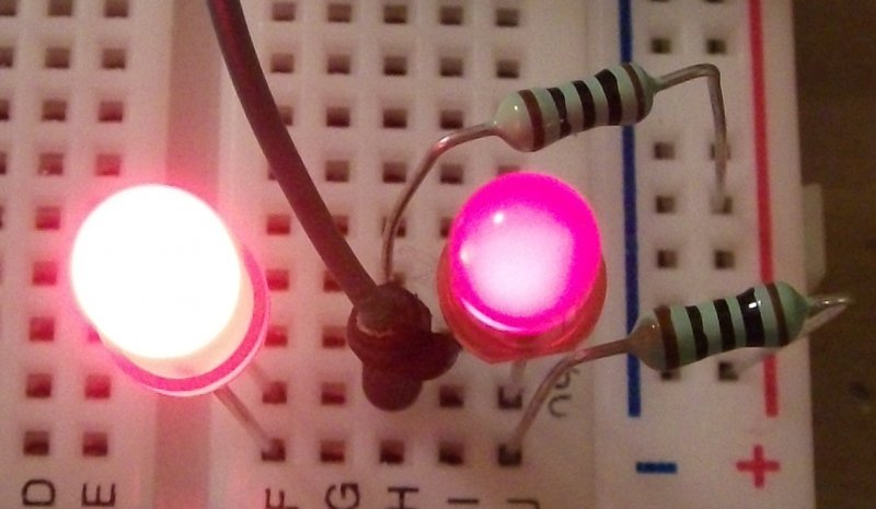 Köszönöm a választ, így már érthetőbb a dolog, bár furcsállom a nagy fénybeli különbséget, meg az enyhe áttetszőséget. Itt van két kép, mindegyiken a bal oldali az eddigi, a jobb oldali a mostani. (2. kép: 3V, 100 ohm) Csak halkan kérdezem, nem lehet hogy ez a transzparens?