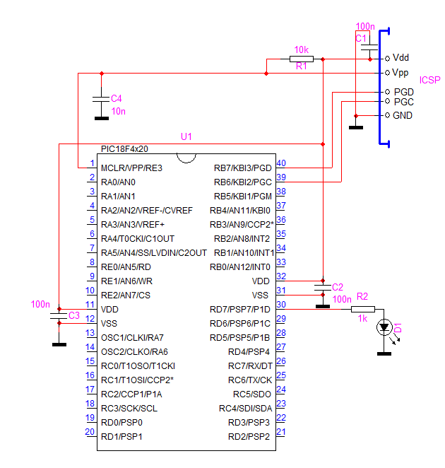 - Az MCLR lábat, 10kohm-mal fel kell húzni a Vdd tápfeszültségre.