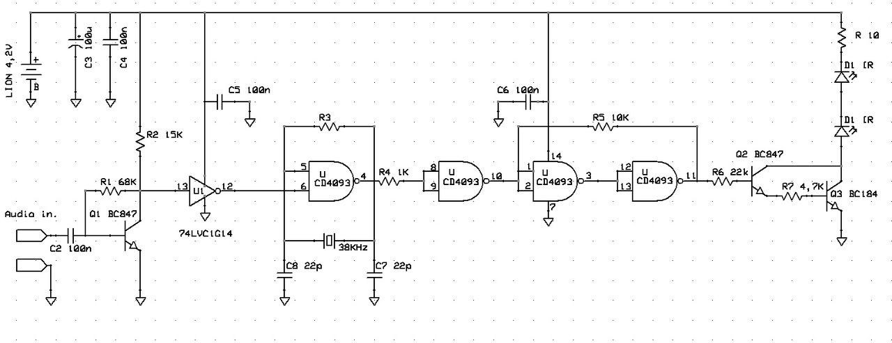 Össze is raktam ezt a kis áramkört, az infra protokol analizátor szerint minden ok, mégsem vezérli a készüléket. Vajon miért? Én ara gondolok hogy az audio jel erősítésekor a jelsorozat torzulást szenved amivel már a vevő utáni mikrovezérő hibajavítása sem tud mit kezdeni. Mellékeltem a kapcsolást, szerintetek miért nem működik?