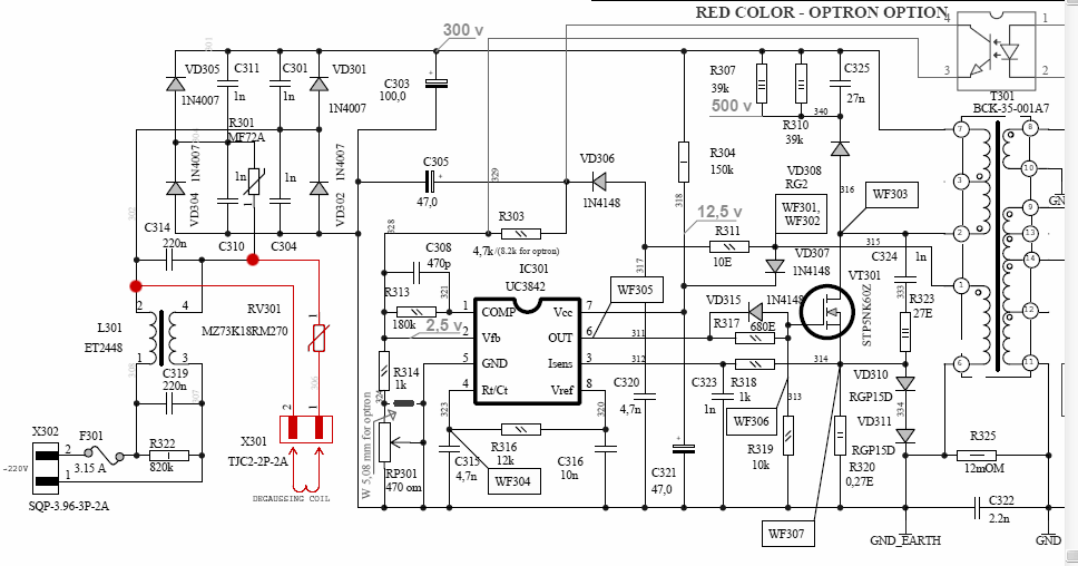 Van is egy kapcsolási rajzom a tápegység részről, és azon be is jelöltem (pirossal), hogy hol is sejtem a problémát (a 40 ohmos belső ellenállást a 18 ohmos termisztor és a 20 ohmos mágnesező hurok okozhatja, amik előtét nélkül párhuzamosan van kötve a bemenetre) csakhogy nem tudom, hogy mit kéne tenni, hogy a rövidzárt megszüntessem.