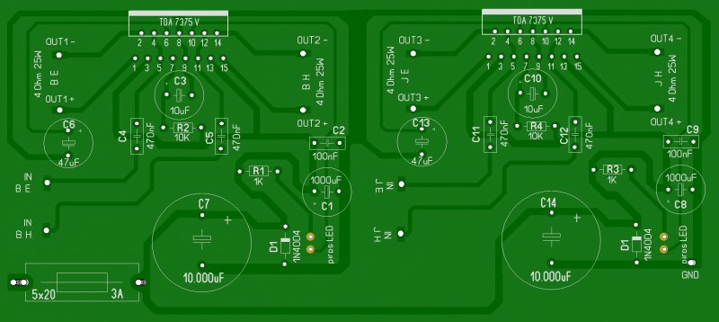 Tudom, hogy nem feltétlenűl ide illik az alábbi kérdésem, de sajnos az ezzel foglalkozó fórumon nincs semmi mozgás. Szeretnék megépiteni két TDA7375-ből egy 4x25W-os autós erősitőt. Mivel nem igazán találtam ilyen kapcs.-ot, ezért a fórumot + adatlapot böngészve megterveztem a nyákot. Le tudnátok-e ellenőrizni, hogy jó-e a rajz, megfelelően működne ebben a változatban? Szerintetek jó-e a 2 "nagy" kondi táp-szűrésnek, puffernak? A védő dióda polaritása jó-e? Egyébként Sprint Layout-tal készült, és az IC-t én készitettem az adatlapja alapján. Bármely észrevételt, javaslatot szivesen fogadok! Előre is köszönöm! Üdv.!