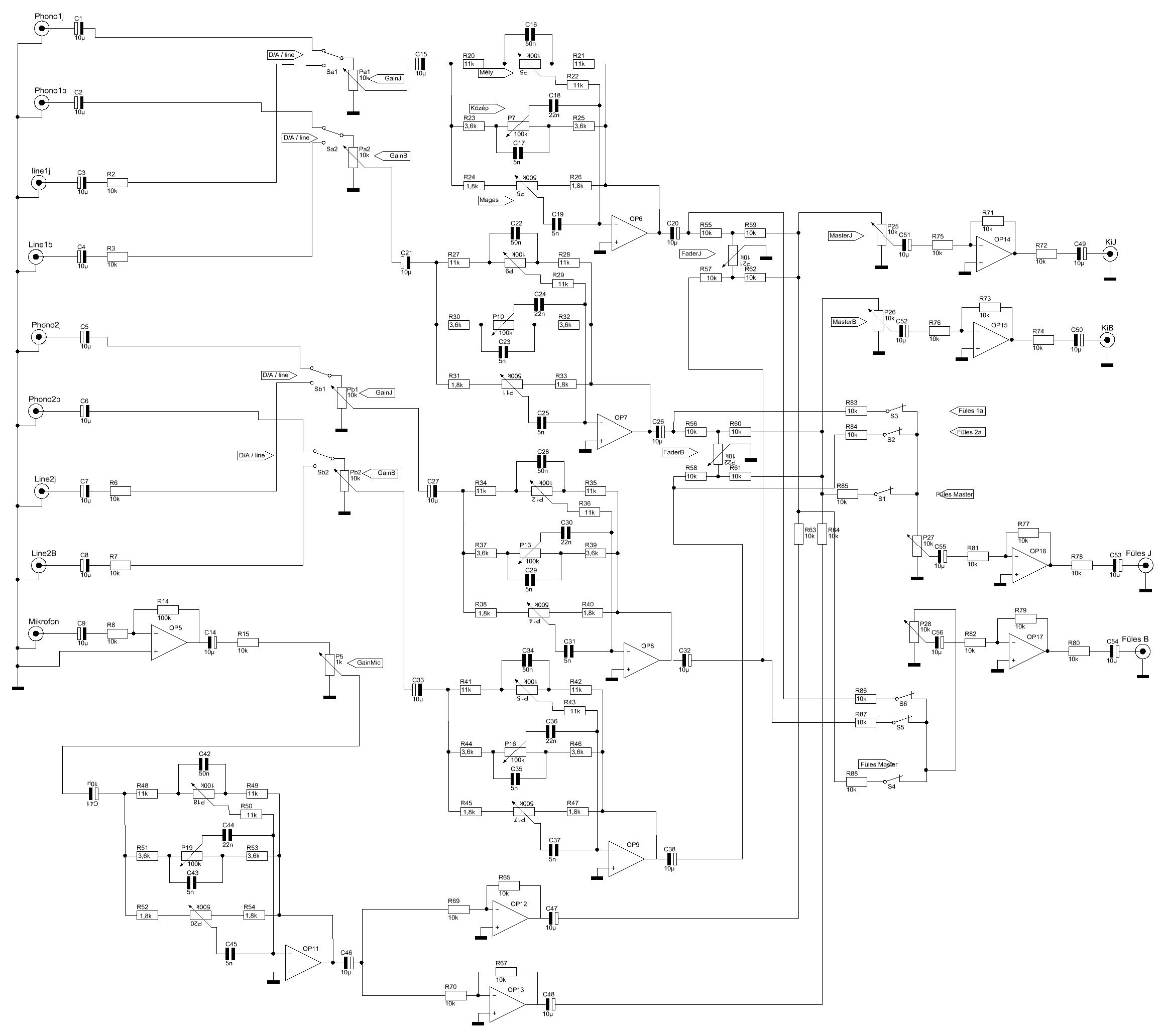 Szia! a Bemeneteket elfelejtettem átnevezni de bármelyik lehet a line és bármelyik a D/A.. Opa lehet tl072 ne5532 ezekben 2 opa van egyszerre a jobb minőségű az NE5532 de drágább is.. S1-S6 ig jól gondoltad a fejhallgató kimenet kapcsolója de ezt is meg lehetne oldani másképp ha más igényeid vannak.. pl egyik oldalon a fülesban a master szóljon a másikban a kívánt bemenet.