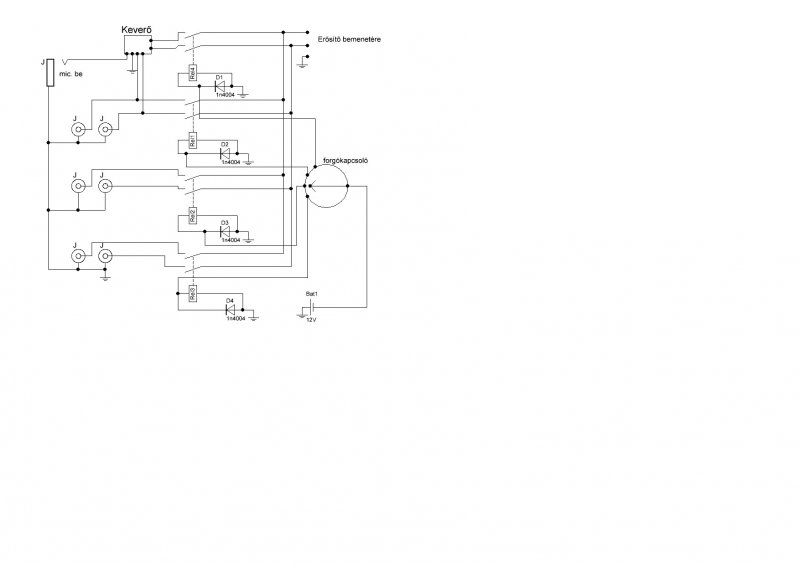 Köszi mind2-nek és lenne még egy kérdésem, elméletbe összeraktam magamnak egy nagyon egyszerű bemenetválasztót, és le is rajzoltam, megnéznétek hogy működőképes megoldás-e? (a legfelső bemenet az a mikrofonnal együtt él, a többin nem lehetséges mikrofon alákeverése)