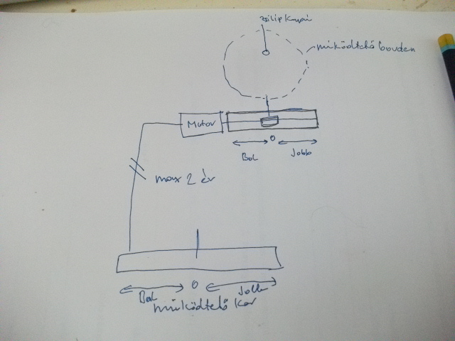Lerajzoltam milyen vezérlést szeretnék a működtető kar mozgását követné a zsilip kaput működtető bovden. A középállás a 0 pont innen indul a működtető kar jobbra vagy balra. A 0 pont és a jobb illetve a bal végpontok között is kellene jobbra vagy balra irányítani. Kösz nektek most már pontosan és illusztrálva meghatároztam a feladatott. Ezzel kellene egy zsilip kaput működtetni, hogy jobbra vagy balra nyisson különböző pozíciókban. Fontos a működtető kar mozgási sebességének működtetése. (Gyorsan zárom a zsilipet vagy lassan.)