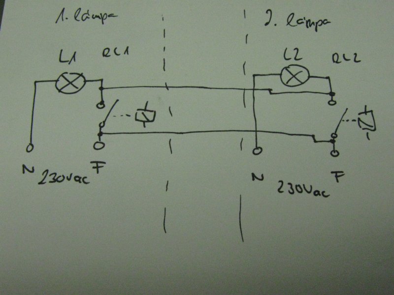 Így gondoltam.Az 1.számú lámpa relé záróérintkezőre kellene egy kéteres vezetéket forrasztanod, amit elviszel a 2.számú relé záróérintkezőjére.