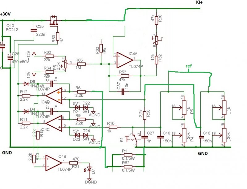 Mint ahogyan a rajzon is látszik, annyit akarok csupán, hogy a negatív ágban legyen az a 2db ellenállás(R1,R52), amin mérhető a felvett áram. Ehhez szeretnék egy kis segítséget, hogy az IC4D komparátor bekötése hogyan is alakul az új helyzetben.