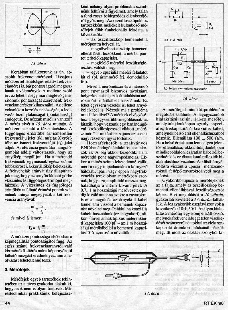 Pedig logikus. Az 1:1 osztásarányú passzív mérőfejnél a bemeneti kapacításhoz (a szkópéhoz) hozzáadódik a koax méterenkénti 50-100 pF-nyi kapacítása és az beterheli így a mérendőt (nagyobb frekin). Az osztással rendelkező passzív mérőfej egy frkvenciakompenzált ellenállásosztó. Itt a mérőfej hegyében lévő kis kapacitás sorbakapcsolódik a szkóp bemenetével, így csökkenti a szkóp bemeneti kapacitását. Persze ekkor az osztás miatt csökken az érzékenység (ilyenkor jön az aktív mérőfej).