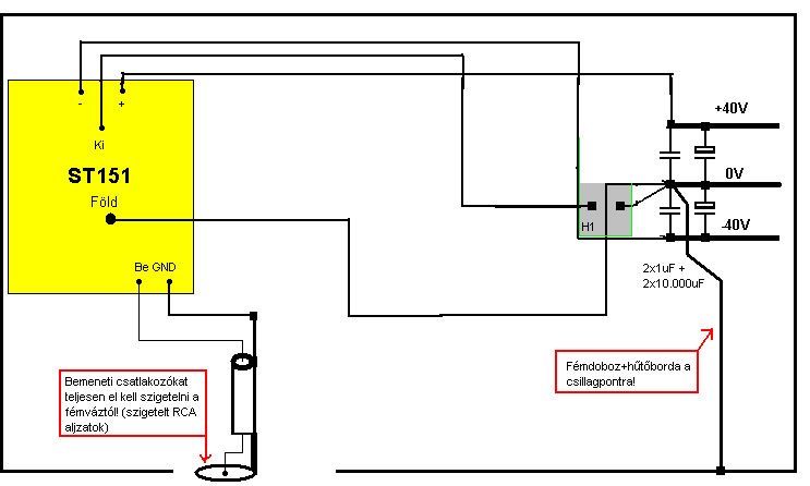 Üdv ! Nekifogtam ennek az erősítőnek !A kérdéseim a következők ! Valakinek van egy kész erősítő erről a kapcsolásról hogy lássam kb mekkora hűtést szereljek neki ! A másik kérdés a bal alsó sarkában van egy különálló valami amiben van párhuzamosan két dióda és egy ellenállás az mi az hova tartozik minek jó?ST151