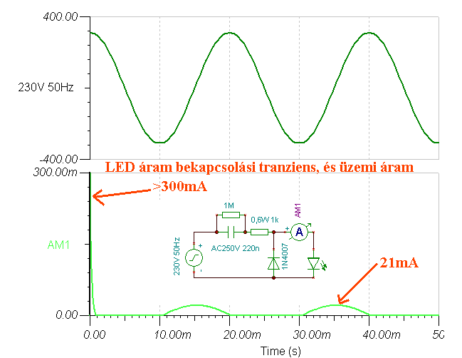 Az elötétkondival mindig kell soros ellenállás, mert ha a bekapcsolás pillanata éppen a szinusz maximumára esik (kb. 310V) és a kondi ki volt sülve, akkor csak az ellenállás korlátozza a tranziens áramimpulzust (300ohm esetén, kb. 1A-re). A nagyobb áramimpulzusok löecsökkentik a LED élettertamát (nem feltétlenül megy tönkre azonnal)