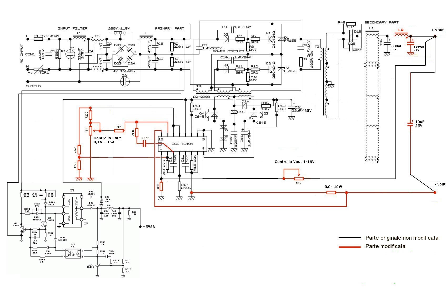 Kár hogy nincs erről az átalakításról egy átfogó cikk (részegységek működése stb.), egyből kevesebb kérdés lenne. Ha nagyon sok időm meg persze kedvem lesz majd írok egyet, de hát nem kis munka. Az az olasz vagy spanyol rajz amit csatoltál tökéletes. Ha 25V-nál nagyobb feszültség kell akkor aszerint építsd meg. Ha elég a 25V is, akkor aszerint amit csatolok. A kondi amiről írsz (3-as láb), nem kell. Nem tudom melyik pufferra gondolsz, a primer oldalra elég az ami benne van (330-470µF/200V) a szekunderre pedig bőven elég 1000uF, de a 470µF is, enyémben is az van. Semmilyen tranyót nem kell cserélni. Az LM317 a ventillátor miatt kellhet. Az ugye 12V-ról megy, ha viszont letekered a fesz potit mondjuk 2V-ra a ventillátor nem fog tudni a szekunder feszültségről menni. A ventillátor táplálásának 4 módja van: 1. Külön kis nyáktrafóról adsz neki 12V-ot 2. Rákötöd a Standby áramkörre ami a vezérlést is táplálja (ezt nem ajánlom mert ezek általában elég gyengék) 3. A kibontott apró diódákból (4148 is jó) csinálsz egy graetz-et, amit rákötsz a teljes szekunderre, így ezen ha teljesen felcsavarod a fesz potit lesz kb. 50V-od, ha teljesen lecsavarod akkor pedig kb. 2,5V, amit stabilizálsz a ventillátor számára. (Ennek a hátránya hogy csak akkor fog menni a ventillátor ha itt legalább 5V van vagyis legalább 2,5 vagy 5V a kimeneti feszültség attól függően hogy a 25 vagy az 50V-os átalakítást csináltad). 4. Simán a kimenet feszültségéről táplálod a ventillátort és abból stabilizálsz, a hátrány ugyanaz, 5V alatt nem fog elindulni. Az áram és a feszültség szabályozása is tökéletesen működik a csatolt rajz szerint, semmilyen plusz OPA beépítésére nincs szükség. Azt majdnem elfelejtettem hogy az alkatrész értékein módosítottam a szám íze szerint.