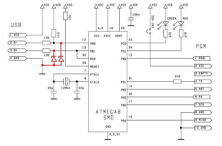 Azok a zenerek nem a programozót védik, hanem a PC 3.3V -os USB csatoló áramköreit - Vannak olyanok, amik tönkremennek az 5V -os jelszintektől és lehetnek olyanok, amik hibásnak vélik a csatolt eszközt. A lényeg, hogy a diódák nem hagyhatók el következmények nélkül.