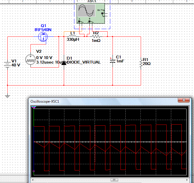 A kondenzátoros szűrés miatt a kimeneten nem veszünk észre feszültség emelkedést. Középértékben pedig nem is szabadna észrevennünk mivel Step-Down-nál az Uki=Tbe/T*Ube.
