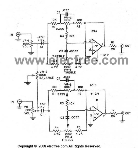 - De ez a kapcsolás, sem túl nagy durranás. Mert ez a hangszínszabályzó akkor működik megfelelően, ha kis impedancián hajtjuk meg. De itt egy 100kohm-os poti van a bemeneten. Vagy is egy előerősítő fokozat nem ártott volna. Ha nem szükséges erősítés a kapcsolástól, akkor egy követő erősítő is bőven megtette volna. Az illesztette volna az impedanciát.