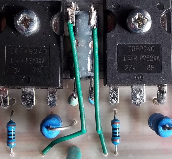 A végleges verzióm (aminek a rajzát stb. ide is feltettem) már jó, annál ha jól emlékszem 3-4V körül marad a feteken (+/-84V körüli táppal adja le a 400W szinuszt 8 ohmra, kb. 56-57V effektív van a műterhelésen).