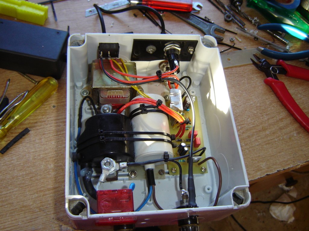 Hogy a kondit mennyire bírja feltölteni 1 mp alatt az nagyrészben az inverter kimenetén lévő trafótól függ (persze kitöltési tényező és kimeneti tranyó bázisáram is, de ezt vegyük állandónak az említett nyáknál) minimum 15VA-es 230/6V-os, normál 50Hz-es trafó az áramkörbe és elég a BUT56 tranyó is vagy az 555 kímélése céljából a többiek által javasolt BU806 darlington. Képen az én elrendezésem - ma készült - látható (inverter trafója > duplakazettás kidobott magnóból, ingyen természetesen)