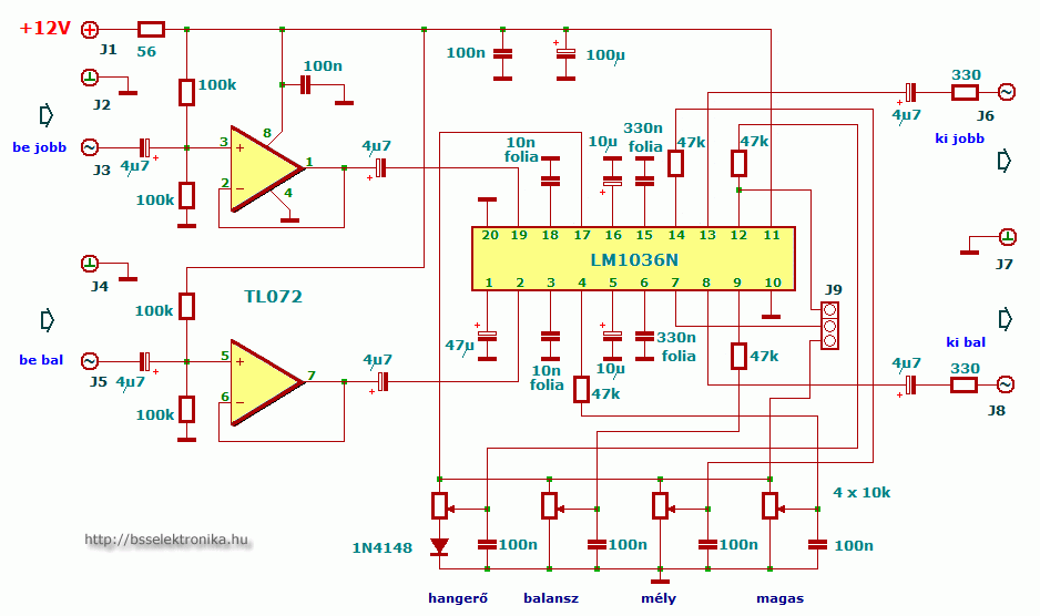 Az LM1036-al már készítettem egy erősítőt, azzal szép hangja van, viszont amit említettem másik előerősítő, azzal az alapzaj is sok. Azt szeretném elérni, hogy a végfokból ki tudjam hozni amit tud. Az LM1036 azért tetszik, mert van benne minden ami kell, hangszínszabályzó, jobb-bal vezérlés meg a többi, csak nem hajtja meg rendesen a végfokot.