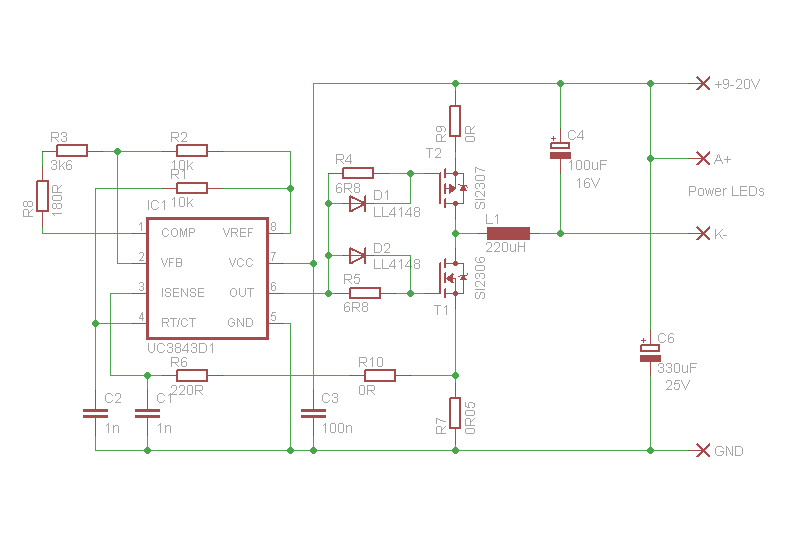 UC3843 IC-vel szeretnék LED meghajtót építeni. Ez elvileg egy "High Performance Current Mode Controllers" IC, amit off-line és DC-DC konverterekben alkalmaznak. Próbáltam már külföldi fórumokon keresgélni, de hiányosak a közzétett ábrák. Egy helyen találtam ezt, de gyanús a 0.05Ohm áramhatároló. Tud valaki segíteni?