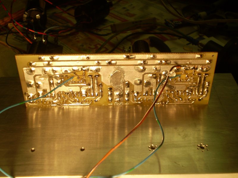 Sziasztok! Elkészítettem egy panelt a majdan fázisfordítóval hídban üzemelő erősítőből. Jellel működik. Egyetlen rendellenességet tapasztaltam: az egyik csatorna nyitott bemenetnél gerjed. Azért érthetetlen számomra, mert a két fokozat teljesen egyforma, sőt a gerjedős oldal az, aminél a tápcsatlakozók után közvetlenül ott vannak a szűrő kondik (low-esr).