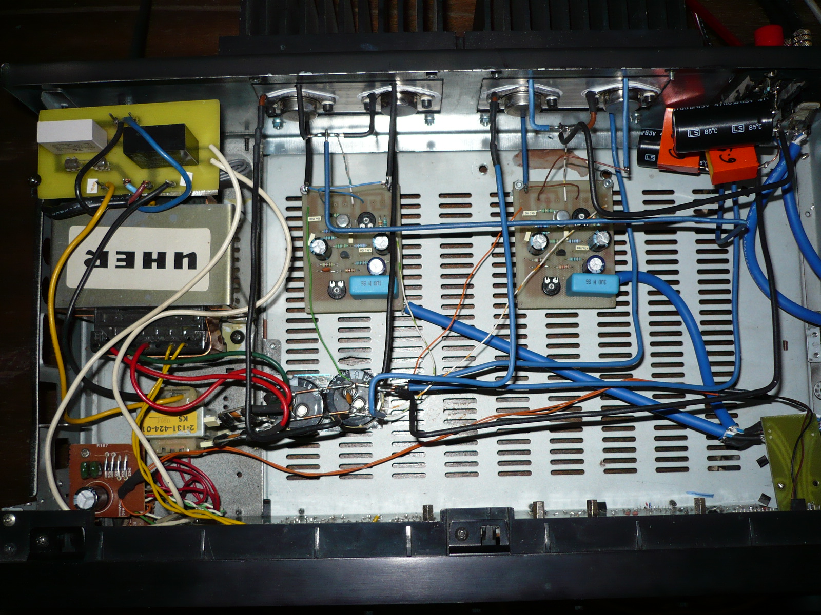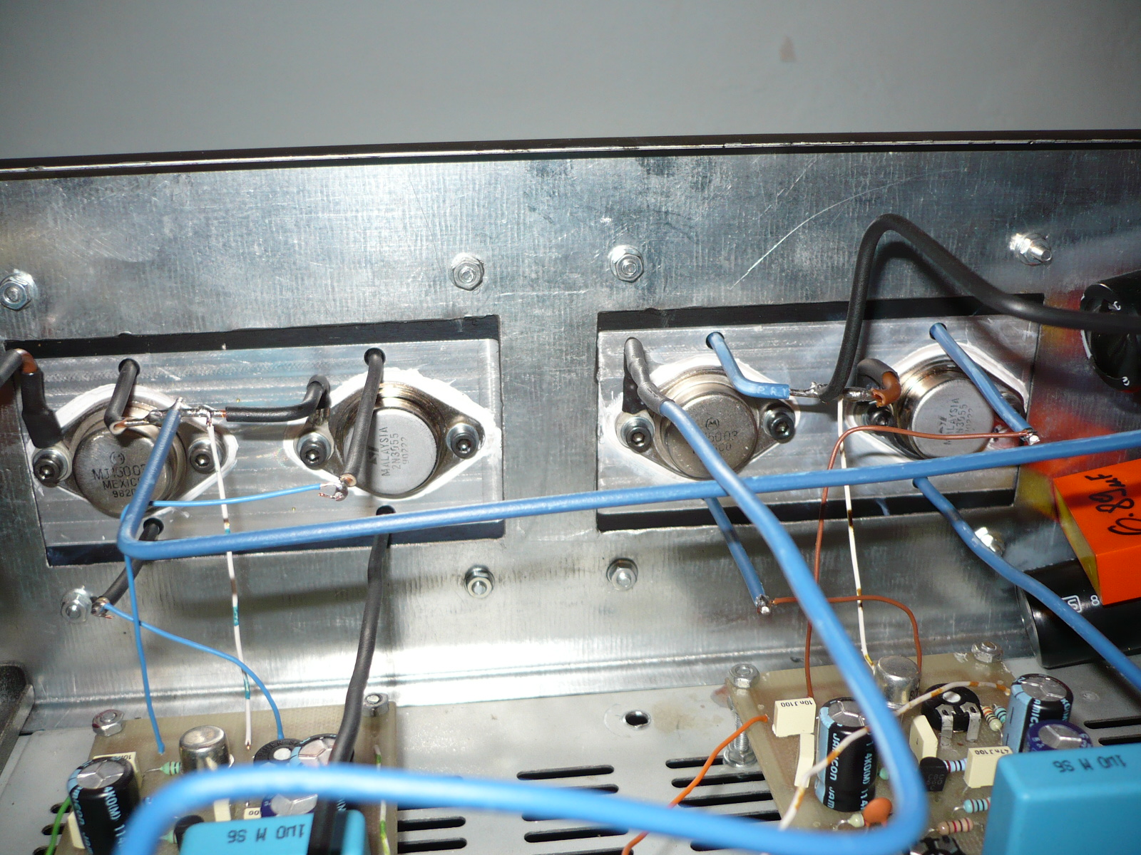Egy kis probléma jelentkezett az én JLH erősítőmmel, azért fordulok felétek mert már teljesen tanácstalan vagyok. Előszőr azt vettem észre, hogy az egyik borda (oldalanként van külön bordája, kép) nem melegszik fel rendesen, azonnal szétszedtem, nyugalmi áram mérés stb... Az jött ki végeredményben, hogy a régebben beállított 1A helyett csak 3-400mA-on megy, ennek mi lehet az oka? kimértem minden alkatrészt és nem találtam hibát benne. A nyugalmi beállíto trimmer előtt van egy ellenállás ami a minimumot állítja be, azthiszem a gyári kapcsoláson ez 680Ohmos, én ezt még az első élesztés után kicseréltem egy 300Ohmosra mert nem tudtam beállítani a kívánt nyugalmi áramot. (37V melett) Nem tudok felülkerekedni a hiba jelenségen, tudtok valami tanácsot adni?