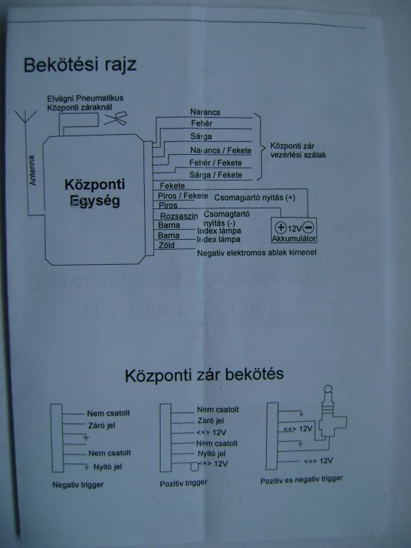 Kösy de egyszerübben nekem már be van szerelve 1 központi zár a vezérlőjével .csak van nekem 1 CARUB távirányitós központi zár vezérlő mint ez http://racing-bazar.hu/alkatresz/ablakemelo-ablaktorlo-zar/uj_univerzalis_kozponti_zar_2_db_bicskakulccsal__csak_5000_ft külömbség anyi hogy nekem rá van irva hogy CARUB meg nem bicskakulcsos hanem 6 lap alaku a távirányitó középen 1 db kerek kék szinü gomb amire szintén Carub van irva és két oldalán 2 gomb az egyiken 1 lakat forma s azon 1 pici led lámpa a másikon 1 csomagtartó forma van!Ép ez a gondom hogy seim nincs hozzá igy kaptam 1 ismimtöl akinek a garázsában porosodot a doboz a dobozra rá van irva KEYLESS ENTRY SYSTEM MADE IN P.R.C NAezt szeretném valahogy rá büvölni a fentebb le irt 6vezetékes meglévő univerzális központi záramra.Előre is kösy a segitséget!""melékeltem 2 db képet a dobozrol s a távirányitórol"
