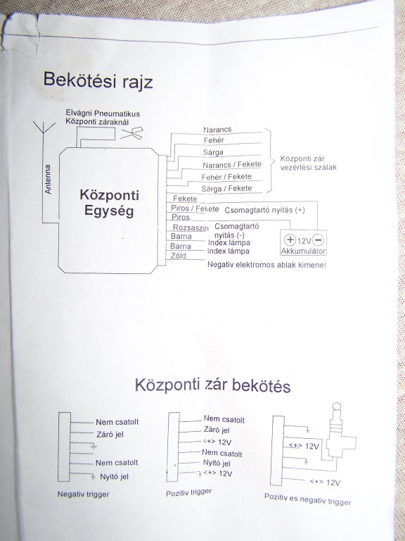 Szép napot mindenkinek segitséget szeretnék kérni ""2002 es swift sedan""kocsimban van univerzális központi zár""hasonló tipus csak az enyémhez nem volt gyárilag távirányitó http://racing-bazar.hu/alkatresz/elektronika/univerzalis_taviranyitos_kozpontizar nekem 1 db 5 vezetékes vezérlő motorbol áll s 3 2 vezetékes ugynevezett követőböl ez igy müködöt is ajtónyitáskor kulcsal""1 darabig aztán az ablak sin beleért a motorba s az széthulott de ez más téma""a lényeg hogy ennek a vezérlő dobozában összesen 6 db vezeték van 1piros"pozitiv"1fekete"test"1kék 1zöld 1fehér 1 barna az utóbi 5 vezeték megy a vezérlő motorhoz!S most kaptam 1 ilyet http://racing-bazar.hu/alkatresz/ablakemelo-ablaktorlo-zar/uj_univerzalis_kozponti_zar_2_db_bicskakulccsal__csak_5000_ft csak nekem még rá van irva hogy CARUB ezt szeretném bekötni""index villogtatással" valahogy csak nincs hozá semmi rajzom hogy milyen szinű vezetékeket hova kéne kötni!!?Anyi nyilvánvaló hogy van 1 db piros az tuti pozitiv meg 1 db fekete az tuti negativ de ezen kivül még van 11db vezeték""2bd citromsárga z 1ik natur a másik fekete csikos,2 db fehér az 1ik natur s van rajta 1db 10es bitositék a másik fekete csikos,2bd rózsaszin 1ik sima másik fekete csikos,2 db barna mindkettő egyforma s mindkettőn 7.5 biztositék.1db vékonyabb piros fekete csikkal,1db zöld,és 1db világos rózsaszin!E-mail cimem :nagyferenc84@citromail.hu válaszokat előre is köszönöm!S bocsi ha rossz helyre irtam!További szép napot!