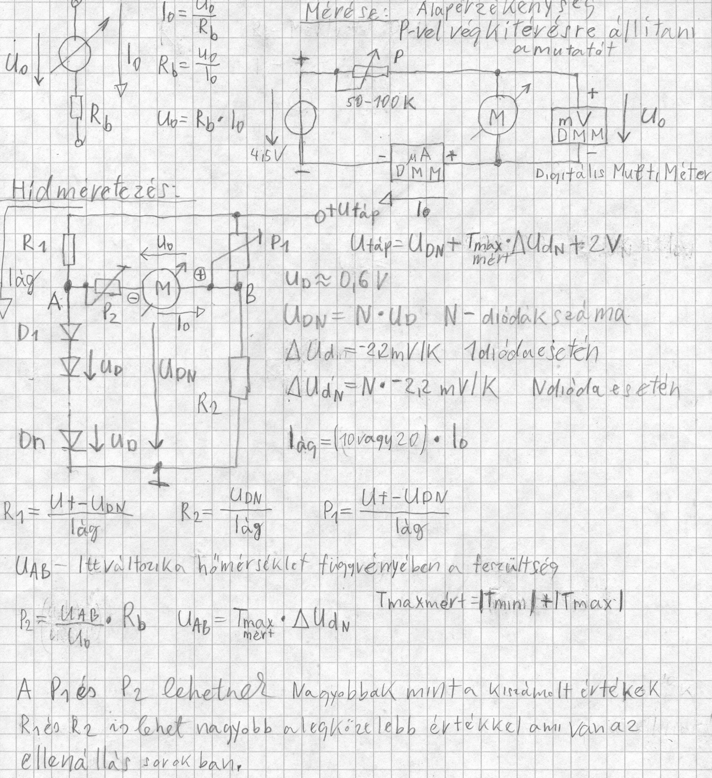 1 2 dolog önkényesen lett felvéve amitől eltérhetsz nyugodtan pl a tápfesz méretezése képlet. De kisebb feszt ne válasszál mert akkor nem teljesülnek a határ feltételek amik a működéshez szükségesek. (pl.: +2 volt hozzáadása a tápfesz számítás esetén ez önkényes volt ) No meg túl nagy Iág -at se válasszál mert az már jelentősen fűtené a diódákat ez pedig a mérés tehetetlenségét is begolyásolja. Pl.: a nagy áramtól a dióda fűt és van körülötte 30 fok így már kevésbé fog érzékelni 1 2 fok változást csak nagyobbat .Tehát csak mértékkel és ész szerű határok között. Iág kb.: 1 - 2 mA legyen max de ha érzéketlen az alapműszered és emiatt jön ki több kb.: 5-10 mA akkor már keressé jobb műszert érzékenyebbet !Minimum 100 uA vagy jobbat 1 - 10 - 50 uA (u - értsd mikró magyar ábécében nincs görög MŰ betű ezért 1 kis u betűvel szokás helyetesíteni mert már majdnem olyan mint a görög MŰ csak bal szára nincs lehúzva mint a MŰ betűnek) Bocsi kicsit nagy lett csatolva !