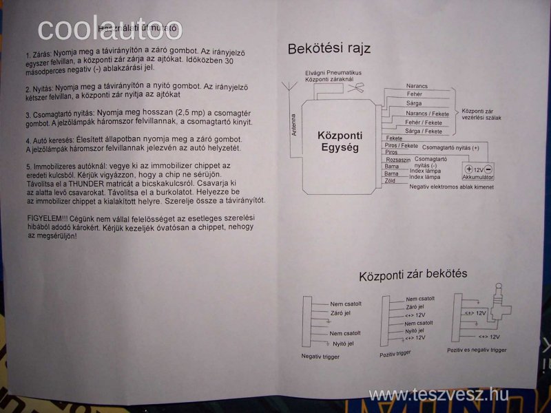 Viszont azt neked kell kideríteni hogy a gyári zárak 4 kábele közül melyik a motoré. Ami ott is biztos hogy a csíkos a negatív, de hogy a két pár közül melyiket használd kiderítheted egy multiméter segítségével úgyhogy volt állásba rakod a műszert és megmozdítod a zárat, valamekkora feszültséget indukálni fog a motor és akkor kiderül hogy melyik kell neked. Vagy az akkus módszer, de ott az a baj hogyha a végállás kapcsoló kapja a szuflát és nem a motor még össze is éghet.