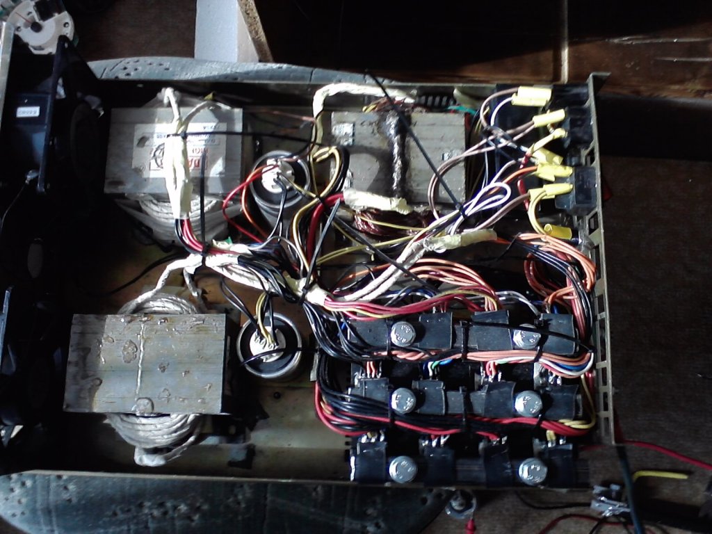 Menne az jobban is, csak közbe félrepillantgattam a készülékre, meg az volt a cél, hogy folymatosan hegesszek, és lássam, hogy bírja-e. Igen, ahogy melegszik, egyre könnyebben megy. Majd lesz oldala is, meg hűtése is, most még le sincsenek fogatva a trafók, csak bedobva a Machintos IIcx házba, ez csak a béta verzió, és a hővédelem sincs még beépítve a tekercsekre.