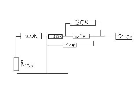 a 10 meg 20 kohm-os ellenállások nincsenek az áramkörben, velük nem kell foglalkozni. Számítsd ki az 50 és 60 kohm-ok eredőjét. Így kapsz egy ellenállást, aminek az értékét add a 30 kohm-oshoz. Az így kapott értékkel párhuzamosan lesz kötve a 40 kohm. Ekkor már csak egy ellenállás lesz qa 70 kohm-al sorba kötve. Összeadod a két értéket és kész. Tehát a bal oldali csoportot kell egyszerűsíteni, amit hozzáadsz a 70 kohm-hoz.