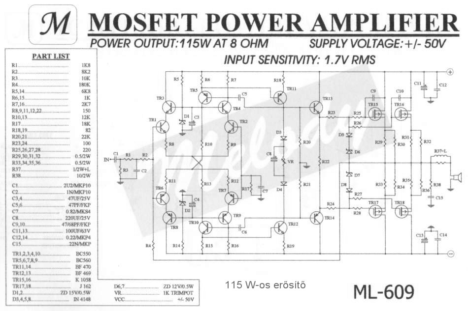 A kondikat nyugodtan helyettesítheted. Ittvan egy kapcsolás, nagyon megbízhato, MJ tranyos. +-60V a rajzon, de +-50Vról is elmegy csak kevesebb power ad le, 100W 8 ohm 200W 4 ohm kb.