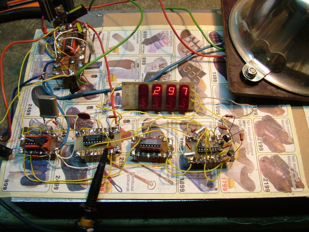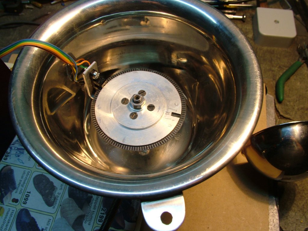 Már többen feltették a szélmérőjüket,az én változatom is készül.A ház inox asztali bogrács,kanalak 9cm átmérőjű inox merőkanál,kanálközépen 30cm átmérő,a csapágyház szintén rozsdamentes.Belül impulzus tárcsa opto kapuval,120 imp/fordulat,szinusz jelet ad.LM2917 frekvencia/fesz. konverter 0,5 % linearitású egyenfeszültséget ad,nekem jobban tettszik az analóg kijelzés egy változó jelnél,másrészt az adatrögzítő is ezt igényli.Az impulzusokból egyperces átlag is felkerül az internetre,amit bárki megnézhet majd.Az elektronika alsó négy ic-je egy hordozható frekimérő,Hz-ben méri majd az impulzusokat az autóval hitelesítéskor,persze előtte egy kis panelra ráteszem az egészet,olyan régen foglalkoztam ilyesmivel,hogy inkább megcsináltam deszkamodellen.Készül egy szélirány mérő is,4bit paralell kimenettel,ezt még nem tudom hogyan lesz az interneten megjelenítve az idő függvényében,hogy jól is nézzen ki.