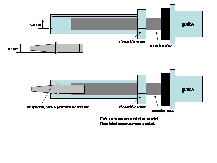 Az a gond, hogy a hegy kúprészének vége 5,4 mm átmérőjű (a perem alatt), míg a páka hegytartó részénél a furat csak 5 mm-es! Ezért nem lehet összecsavarni a pákát. Megpróbáltam lerajzolni, hogy mire gondolok. Ha valaki meg tudná mérni a hegy átmérőjét a kúpos oldal peremének tövében, azt megköszönném!