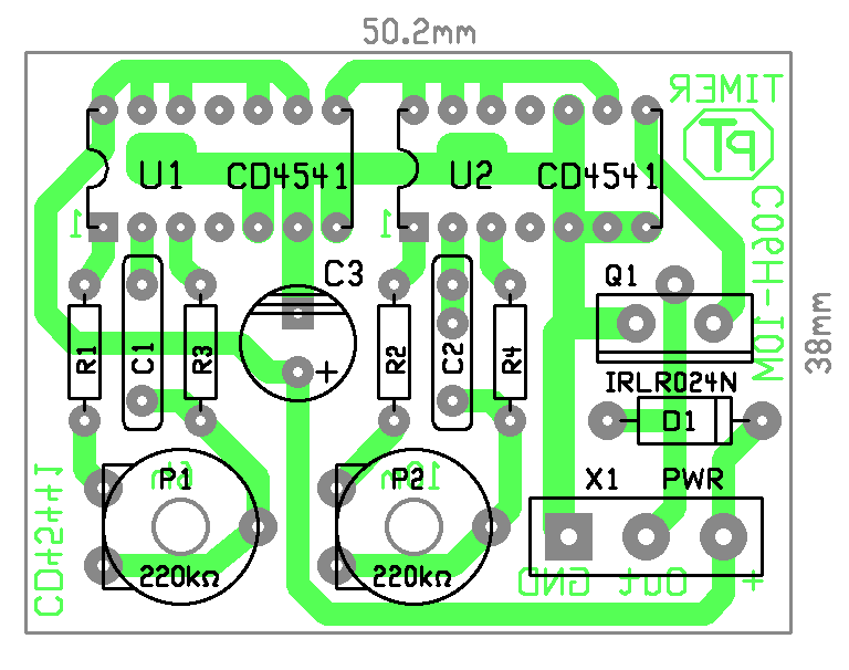 Remélem ez már elég egyszerűnek tűnik. Megkötés mindössze annyi, hogy a motor működési ideje nem lehet hosszabb, mint a motor működés ciklusidejének fele. De a működési idő, a kondik változtatásával, és az "A-B" pontok "programozásával széles tartományban változtatható. Az U1 astabil módban megy, ahol a ciklusidő, C1*(R1+P1)*2,15*2^16 [sec]. Az U2 monostabil módban megy, ahol az impulzus idő idő, C2*(R2+P2)+1,08*2^16 [sec]. üdv! proli007