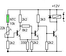 10 kohmos NTC-vel pl. a rajz, 12 voltos relé NC érintkező ki-gombként bekötve.