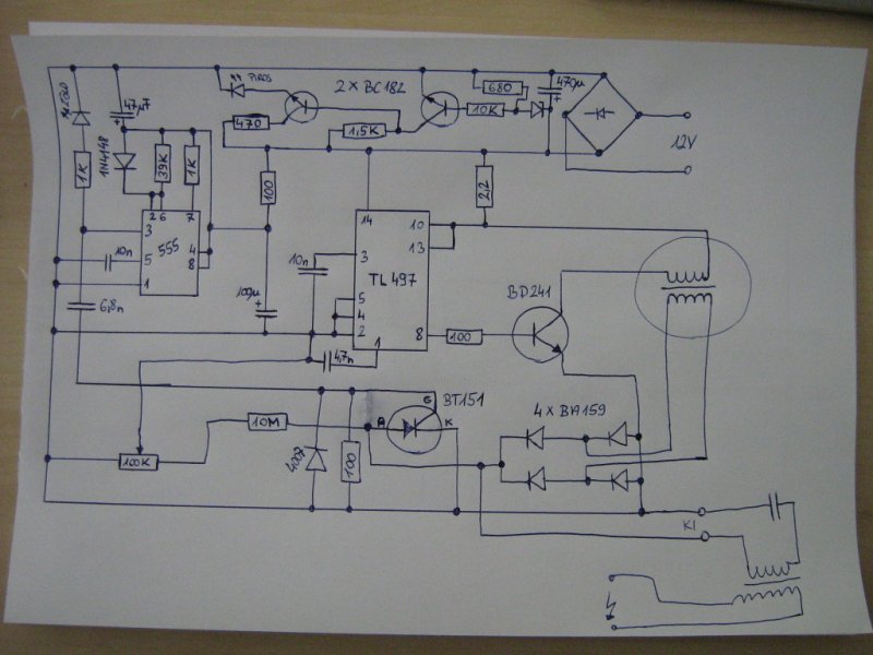 Kirajzoltam nagy nehezen, remélem nem néztem el. Amit le tudtam olvasni azt beírtam. A nagyfesz trafóra egy bazi nagy 10µF kondin keresztül csatlakozik. Az IC ről és tranzisztorokról lecsiszolták a feliratokat.. A diódahídnál és a T1 nél van megbarnulva a nyák. Gondolom a T1 purcant ki, de nem tudom mivel helyettesítsem.. ![]() Ha esetleg valaki ráismer az áramkörre és megvan milyen alkatrészek kellenek hozzá feltehetné, megköszönném...