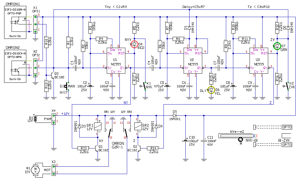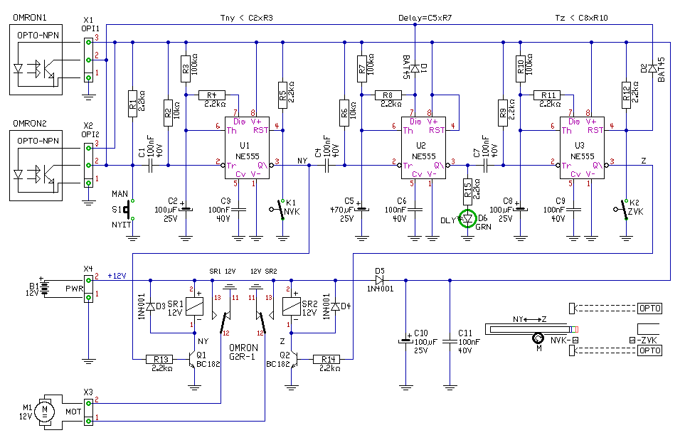 - Úgy gondoltam, hogy van ilyen meg olyan.. De azt is pontosan tudni kell, hogy két vagy háromvezetékes a jeladód, valamint, hogy mikor ad jelet. Ha a kutya előtte van, vagy ha nincs előtte. Vagy is ki kellene próbálnod, egy Led+ellenállással. (adatlapot is megnézhetném, de lusta vagyok. Valamint úgy is ki kell próbálnod a helyszínen mi és hogy működik. (távolság, magasság reflexió, környezeti fény..) - Ha már azt tudd, hogy milyen logikai szintet ad az opto, ha a kutya előtte áll, hozzá tudjuk illeszteni a kapcsoláshoz. (Jelenleg ez egy huzalozott negatív logikájú VAGY kapu. Ami akkor ad alacsony szintet, ha bármelyik opto jelzést ad.) De a reléelég vicces lenne, hagyjuk meg azt a motor számára. Vagy logikai áramkört, vagy tranyót kell alkalmazni. - De közben észrevettem egy kis hazárdot a kapcsolásban. Történetesen, hogy nem biztos, hogy az érzékelő maradék feszültsége (szaturáció) megfelelően alacsony lesz. Az 555 Reset lába, ugyan is elég kis feszültségen működik. Ha az opto nem ad ki "0V"-ot, akkor esetleg nem fog helyesen működni. - Remélem érthető amit leírtam, és akkor a módosított rajz. Két Led-et alkalmaztam a szinteltolás céljából, de így legalább jelzi a végállás kapcsolók működését. (elalszik a Led végállásban) üdv! proli007