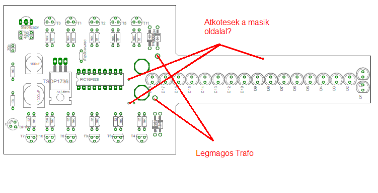 Rorot panel: Ahol a pdf rajzon a kék vonal barnával folytatódik, ott a két oldal össze kell kötni. Ez lehet egy alkatrész kivezetése, amit mind a két oldalon forrasztani kell, de vannak önálló átvezető furatok is, ezeknél a furatba egy levágott kivezetés darabot kell tenni és mind a két oldalon be kell forraszani. A trafó szekunder tekercsének kivezetései valóban a két - két 1N4007 dióda közös pontjaira meg, jobb lenne gyorsabb diódát használni: UF4007, SF18G ... |