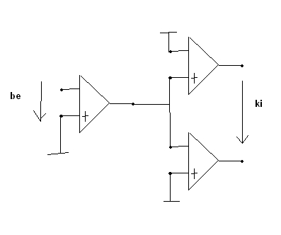 Ha jol ertem akkor arrol lenne szo, hogy a vegtranzisztorokat meghatjo fokozatot alakitanad ugy ki mint ahogy a rajzon szerepel. Ez igy nem mukodne a kovetkezo ok miatt: a komplementer szimmetrikus fokozatnak az a lenyege, hogy a ket ranzisztor ugyanazt a vezerlofeszultseget kapja aminek hatasara az egyik fele a fokozatnak kinyit es vezetni fogja az aramot, a masik fele lezar es nem vezeti az aramot. Ha ellentetes fazisban vezerled az egyik vegtranzisztort a masikhoz kepest akkor vagy allandoan vezeto vagy allandoan lezart allapotban lesz mindket tranzisztor.
