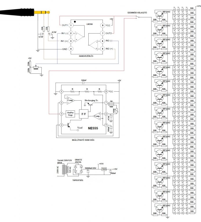 Nem tudom melyik érné meg jobban ha 200db extrafényű ledet vennék vagy ha 5 db 5w-osat? Nekem az lenne a lényeg hogy 30 négyzet métert nagyon jól bevilágítsa és mély hangra vilogjon! Esetleg valami egyszerű kapcsolási rajz ami működik?