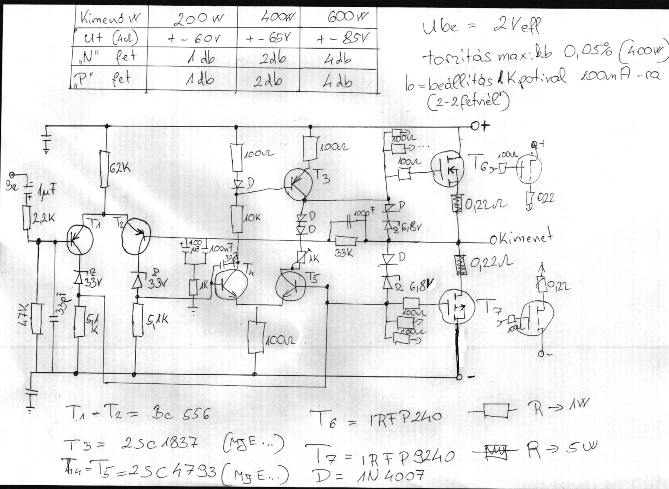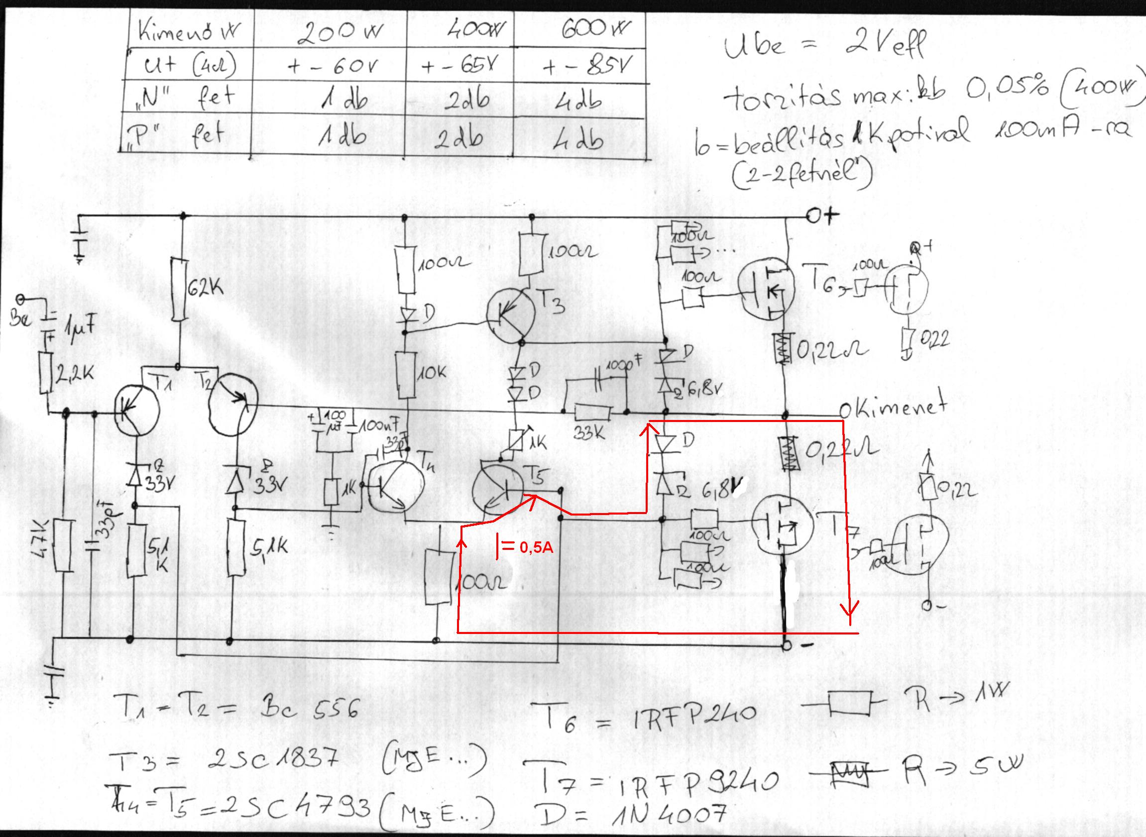 Sziasztok, összeraktam egy prototípus erősítőt ebből a kapcsolásból, de nekem úgy tűnik hogy van egy elvi hiba a rajzban. (A valóságban sem jól működik.) +- 70 V-ról működtetve a 2. diff. erősítő T5-ös tranyóján 0,5A folyik (a BE diódán)és ebben az esetben a diódás túlfeszvédő viszont megpróbálja kb. -7,5V-on tartani a MOSFET G-S feszültségét. Csakhogy pár másodperc múlva izzik a 100 ohm-os ell. és a zener is. Ill. a P csat. MOSFET is teljesen kinyit, és a kimeneten a -táp lenne, de 22 ohmos ell. vannak a tápkörben sorosan és 22 ohm műterhelés van rajta, így kb. -35V jelenik meg a kimeneten. Mi erről a véleményetek? Elsőnek összerakva elindítottam és amikor rosszul működött, akkor a FET-eket levettem. És csak a gate-eket mértem a GND-hez képest. (A bemenet rövidre van zárva.)
