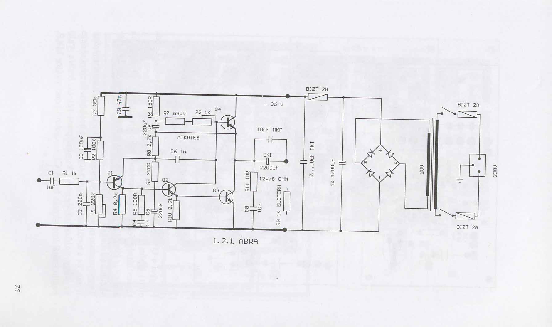 Maga az "A" osztályú erősítő ebben a kapcsolásban Q1 Q2 Q3 tranzisztorokból áll. Q4 tulajdonképpen Q3 munkaellenállása (vezérelt), de Q2 szintén Q4 bázisától kapja a kollektorfeszültségét, ezért is kell a földhöz képest nézni a feszültségeket, hogy tudjuk mennyi Q2 kollektorfeszültsége.